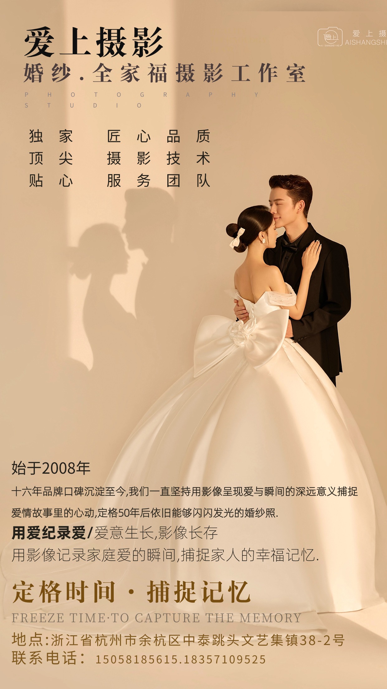 始于2008年 十六年品牌口碑沉淀至今,我们一直坚持用影像呈现爱与瞬间的深远意义捕捉爱情故事里的心动,定格50年后依旧能够闪闪发光的婚纱照. 用爱纪录爱/爱意生长,影像长存 用影像记录家庭爱的瞬间,捕捉家人的幸福记忆. 独家 匠心品质 顶尖 摄影技术 贴心 服务团队